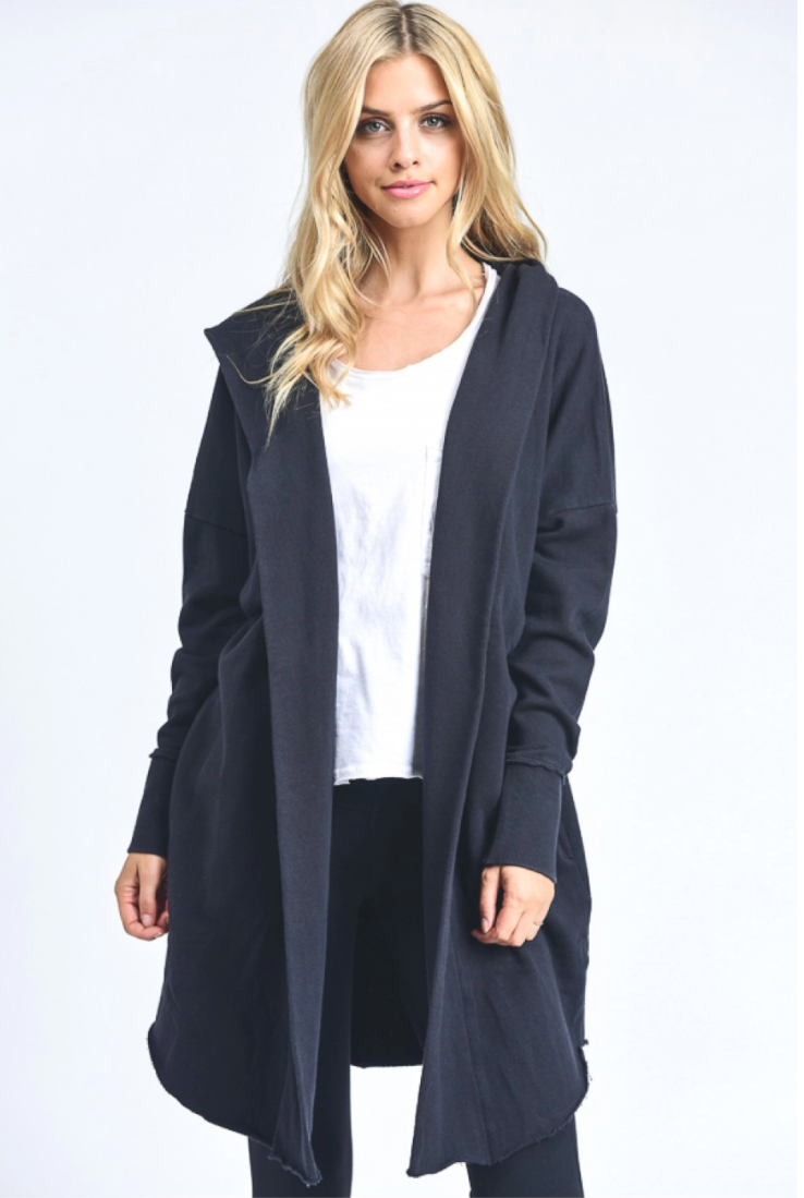 This chic longline hoodie cardigan features an open front and wide cuffed sleeves, and is perfect for those autumn outings. Use the pockets to hold your mittens!